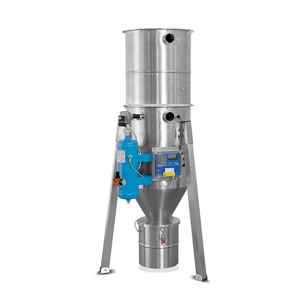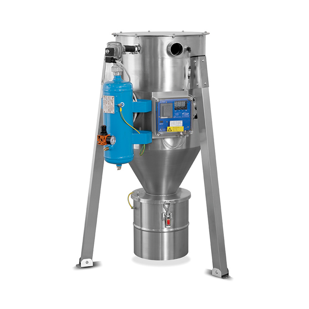 ATEX-zertifizierte Filtereinheit für ZONE II 3D. Zum Anschluss an eine vorhandene Hochdruck-Saugleitung. Struktur aus EDELSTAHL AISI 304; die Filterpatrone wird mittels einer pneumatischen Düse gereinigt, die vom Druckluftbehälter versorgt wird. Die Reinigungsintervalle werden durch einen an einen Delta-P-Sensor angeschlossenen Economizer definiert, um den Reinigungszyklus nur bei Bedarf zu aktivieren. Der vom Trichter gesammelte Staub wird in den darunter liegenden Staubbehälter befördert.