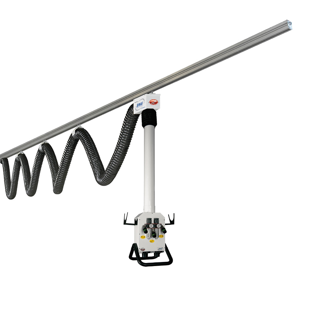 Das Absaugterminal und das Schlauchpaket sind in einem Aluminiumprofil von 6, 9 und 12 Metern integriert. Das Schlauchpaket sowie alle Versorgungsleitungen sind in einer Schleppkette integriert. Dadurch sind keine Schlauchschleifen sichtbar. Das Absaugterminal kann, je nach Wunsch, ganz nach links oder rechts weggeschoben werden. Dadurch ist der gesamte Arbeitsbereich frei. Zusätzlich können in die Schleppkette weitere Leitungen nach Anforderung integriert werden.