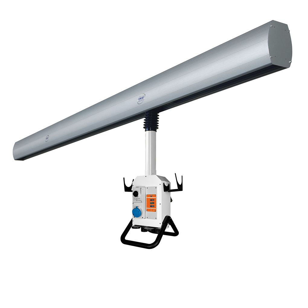 Gleitlinie mit 45 x 65 mm Aluminiumschiene und Vorsatzwagen mit pneumatischer Bremse. Modulare Elemente in 4 Größen erhältlich: 3 bis 12 Meter. Das Schienensystem ist ausgestattet mit einer Serviceampel der Serie „SR“.