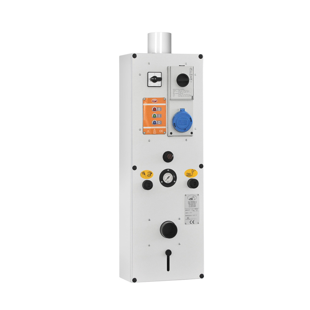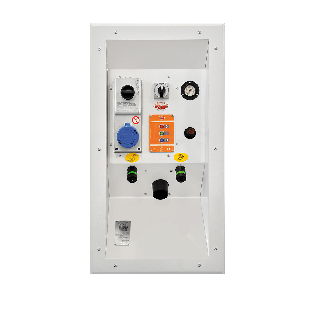 Einfaches und funktionelles Wandterminal. Der Anschluss für einen Absaugschlauch ist mit einer Klappensteuerung (Microswitch) ausgestattet. Sobald die Klappe geöffnet wird, startet die Absaugturbine. Der regelbare Druckluftanschluss erlaubt den Anschluss einer Druckluftmaschine direkt am Wandterminal über den Absaugschlauch „Schlauch-in-Schlauch-System“, oder ein elektrisches Schleifwerkzeug direkt an der eingebauten Steckdose.