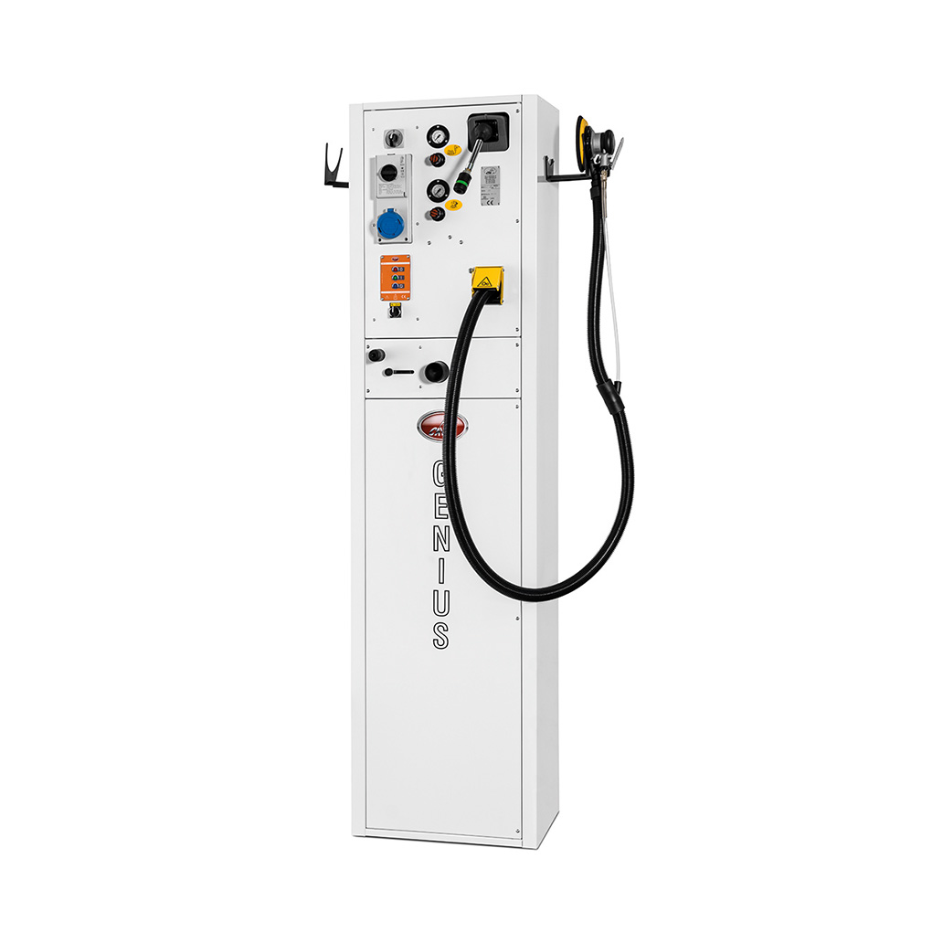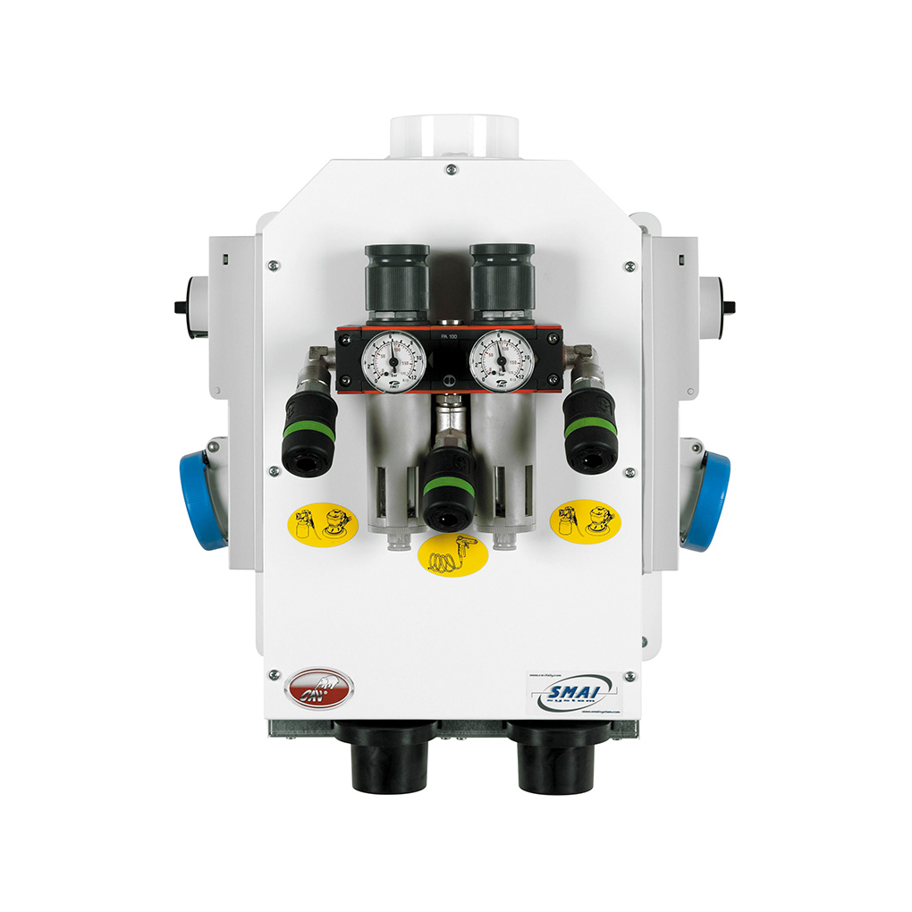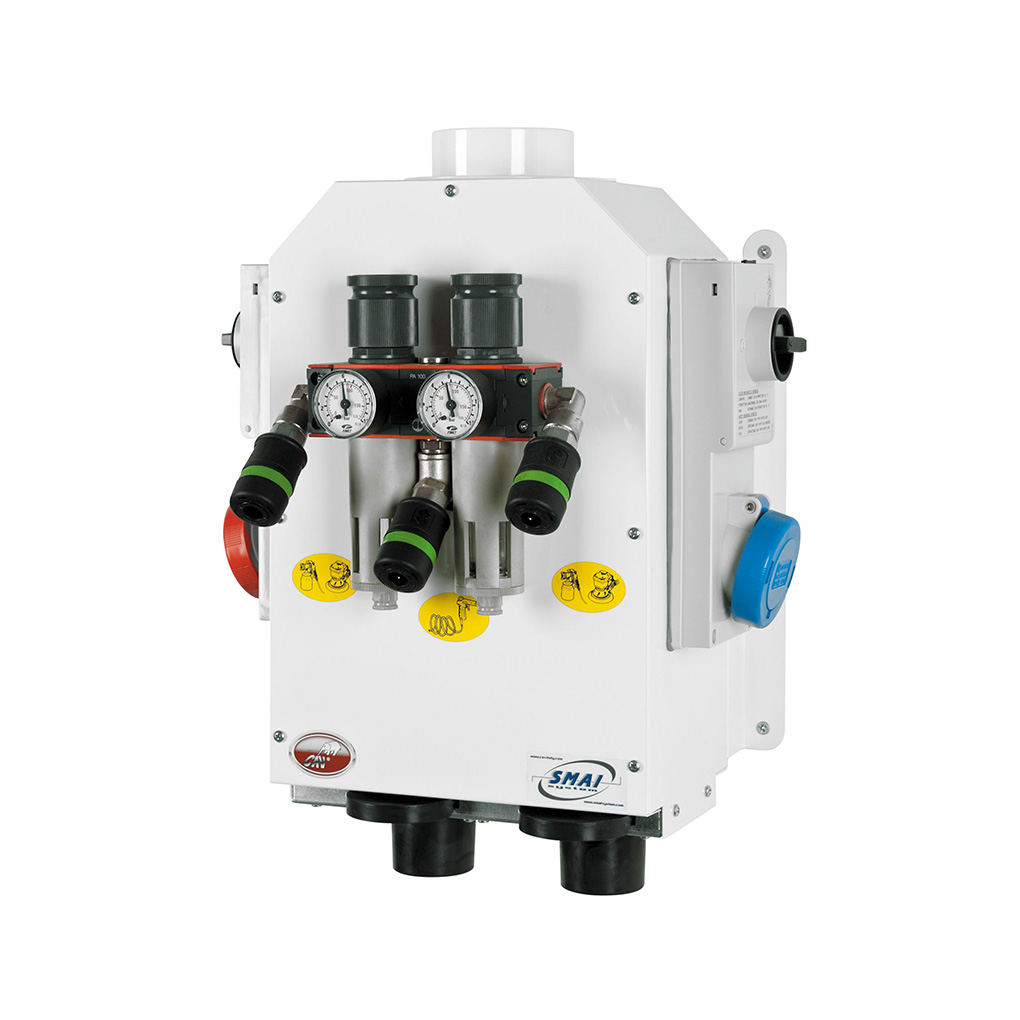 Kompaktes und funktionelles Wandterminal. Der regelbare Druckluftanschluss erlaubt den Anschluss einer Druckluftmaschine direkt am Wandterminal über den Absaugschlauch „Schlauch-in-Schlauch-System“, oder ein elektrisches Schleifwerkzeug direkt an der eingebauten Steckdose. Die Einschaltautomatik der Turbine funktioniert automatisch für Druckluft- und Elektrowerkzeuge über die integrierte Steuerung.