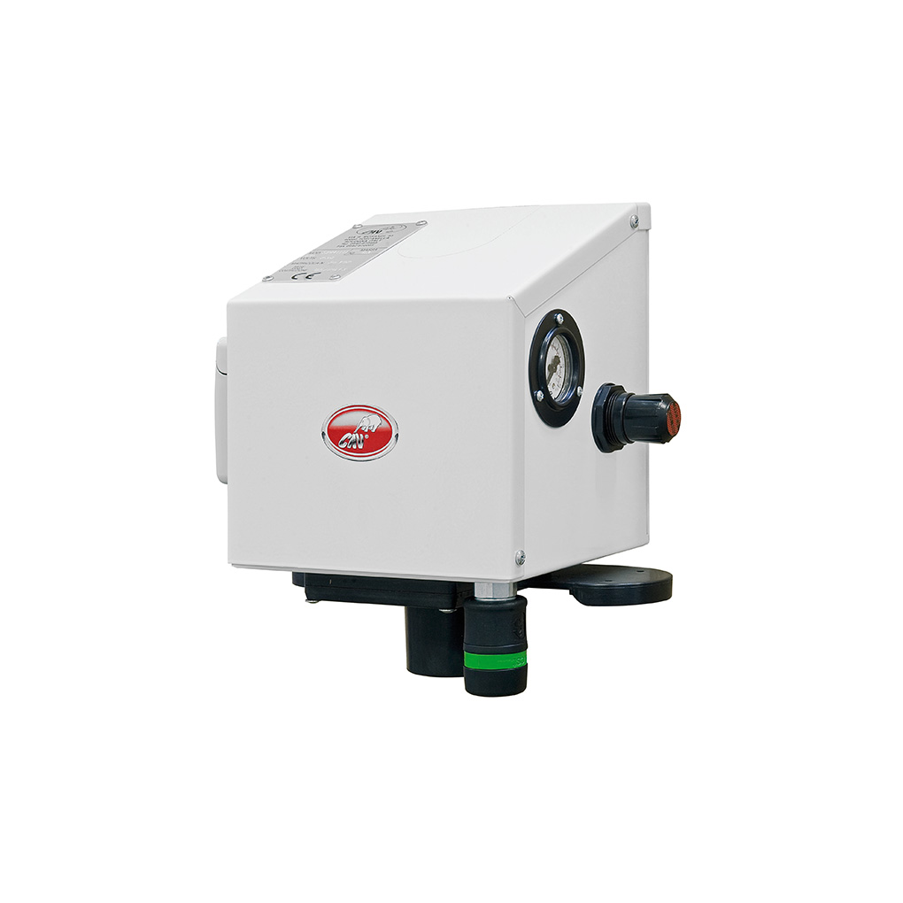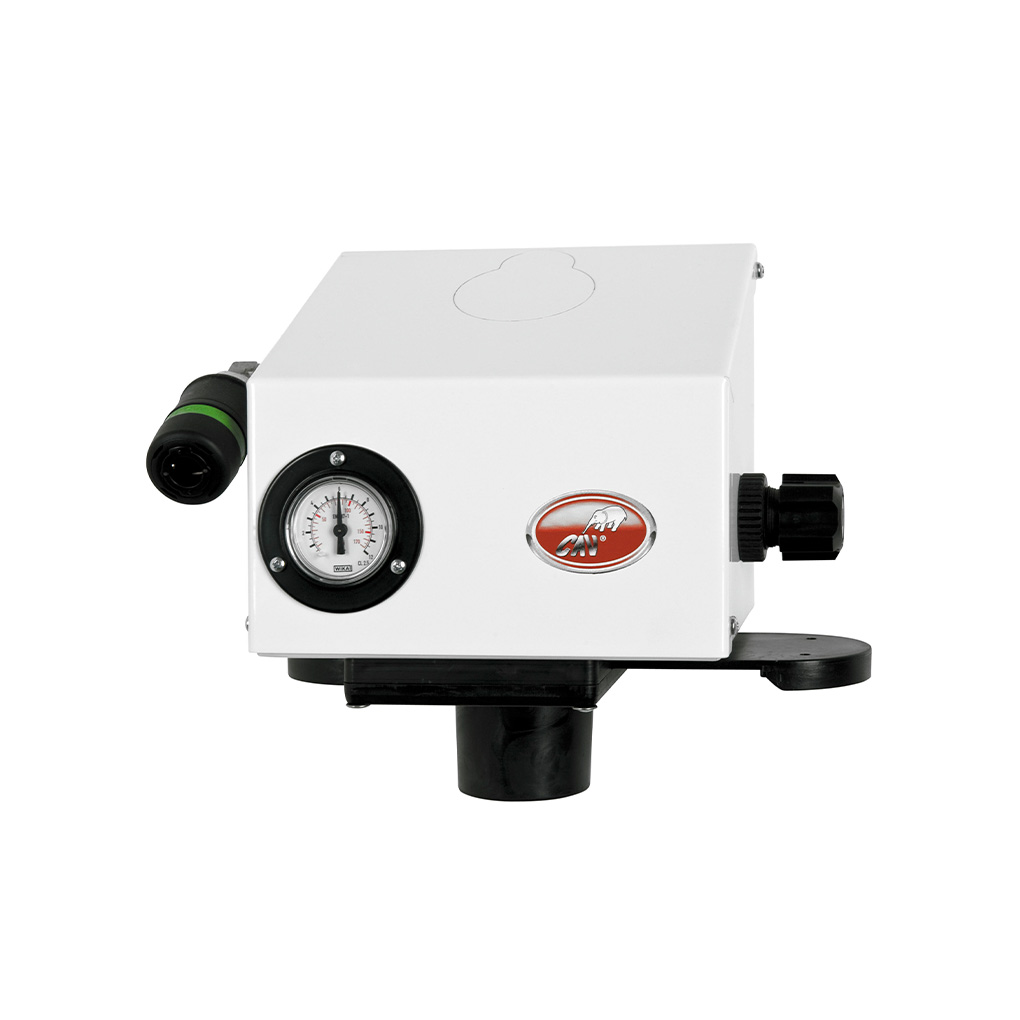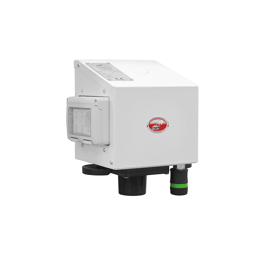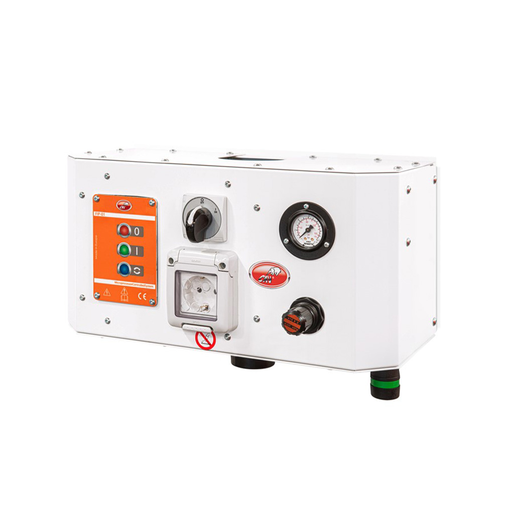 Kompaktes und funktionelles Wandterminal. Der regelbare Druckluftanschluss erlaubt den Anschluss einer Druckluftmaschine direkt am Wandterminal über den Absaugschlauch „Schlauch-in-Schlauch-System“, oder ein elektrisches Schleifwerkzeug direkt an der eingebauten Steckdose. Die Einschaltautomatik der Turbine funktioniert automatisch für Druckluft- und Elektrowerkzeuge über die integrierte Steuerung.