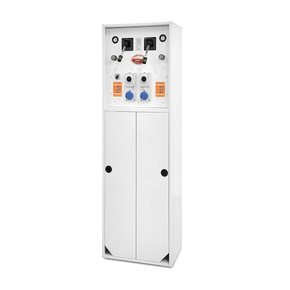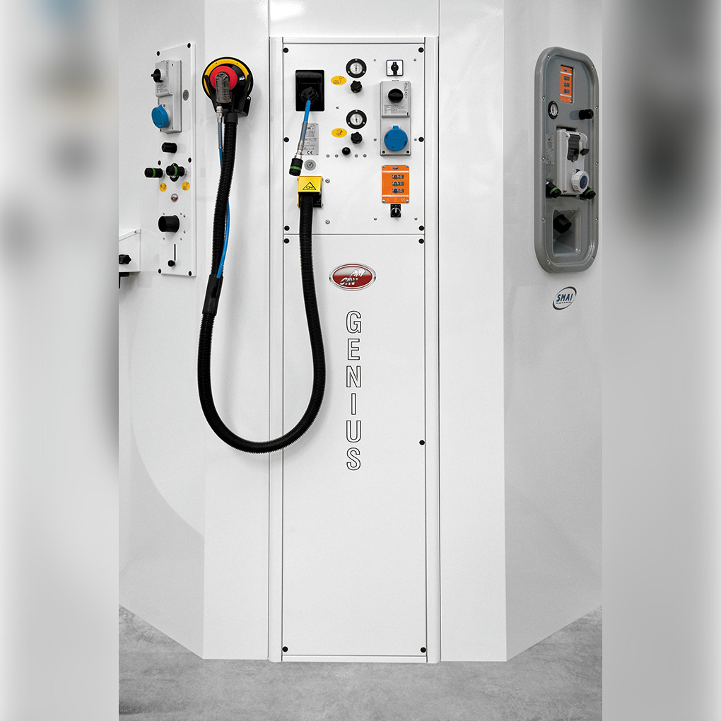 In eine Kabinenwand integrierbares Absaugterminal, versorgt die Arbeitsbereiche mit Anschlüssen für die Absaugung, Druckluft und Strom. Die Einschaltautomatik der Turbine funktioniert automatisch beim Einschalten der Schleifmaschine. Der Absaugkanal wird mittels AUTO-CLOSE-SYSTEM automatisch verschlossen, sobald kein Werkzeug verwendet wird.