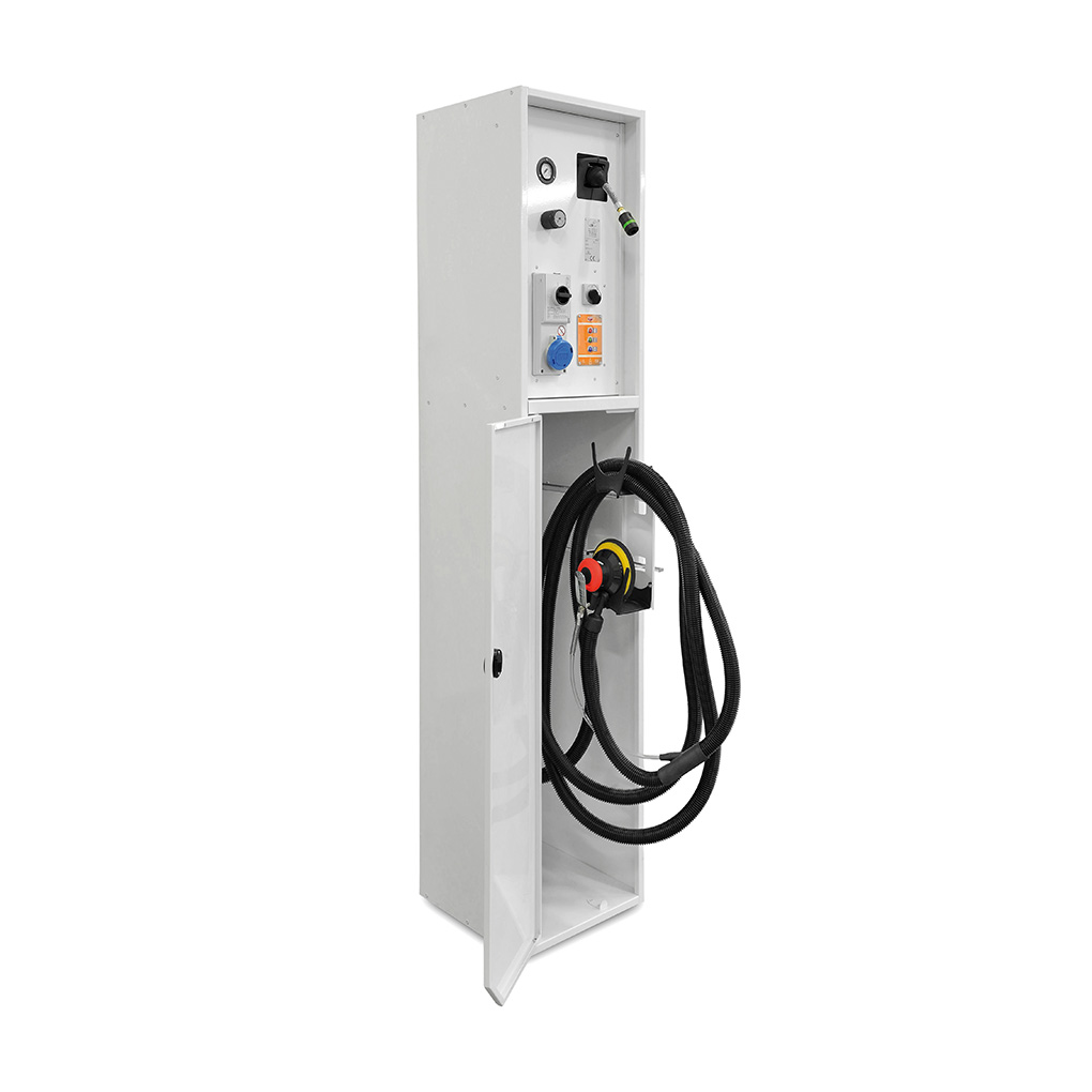 Einfaches und funktionelles Wandterminal. Der Anschluss für einen Absaugschlauch ist mit einer Klappensteuerung (Microswitch) ausgestattet. Sobald die Klappe geöffnet wird, startet die Absaugturbine.